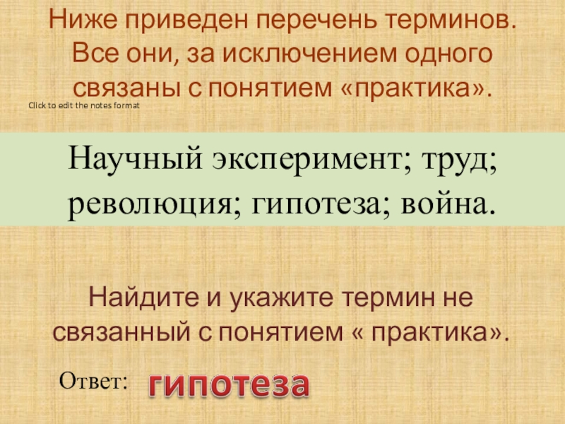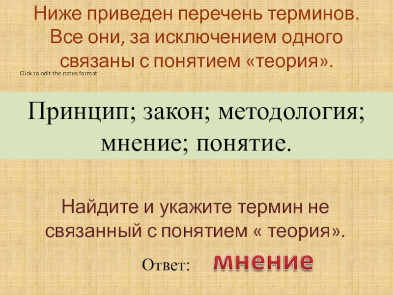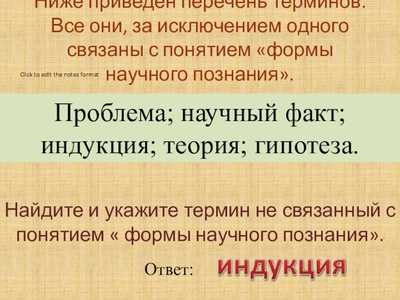 Найдите и укажите термин не связанный с понятием « формы научного познания».