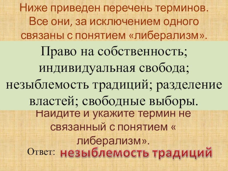 Найдите и укажите термин не связанный с понятием « либерализм».