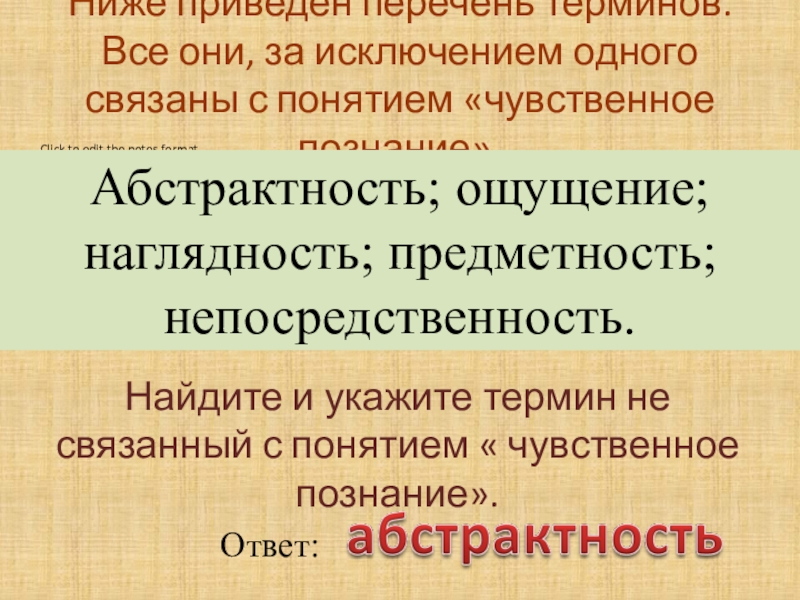 Абстрактность; ощущение; наглядность; предметность; непосредственность.