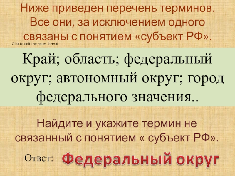 Найдите и укажите термин не связанный с понятием « субъект РФ».