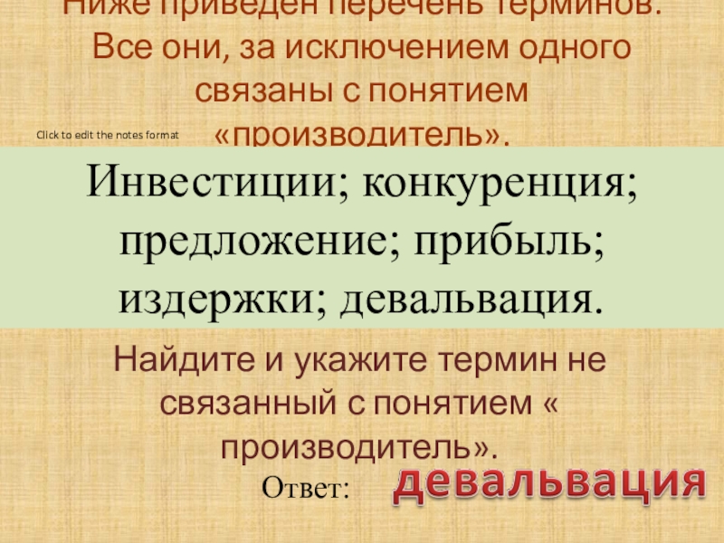 Инвестиции; конкуренция; предложение; прибыль; издержки; девальвация.