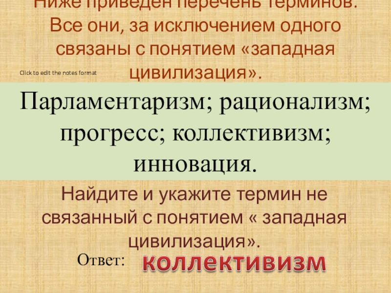 Найдите и укажите термин не связанный с понятием « западная цивилизация».