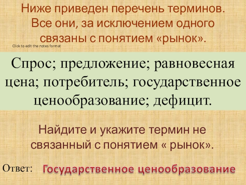 Спрос; предложение; равновесная цена; потребитель; государственное ценообразование; дефицит.