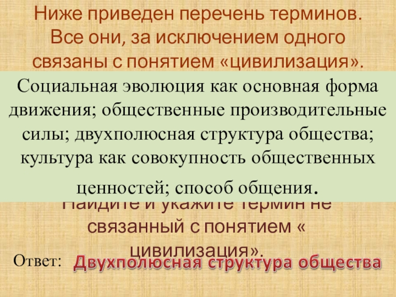 Найдите и укажите термин не связанный с понятием « цивилизация».