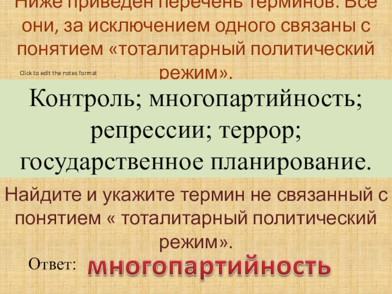 Найдите и укажите термин не связанный с понятием « тоталитарный политический режим».