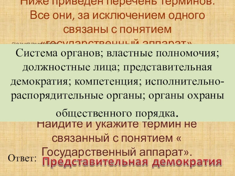 Найдите и укажите термин не связанный с понятием « Государственный аппарат».