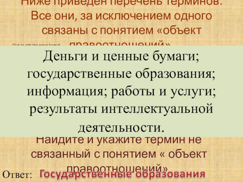 Найдите и укажите термин не связанный с понятием « объект правоотношений».