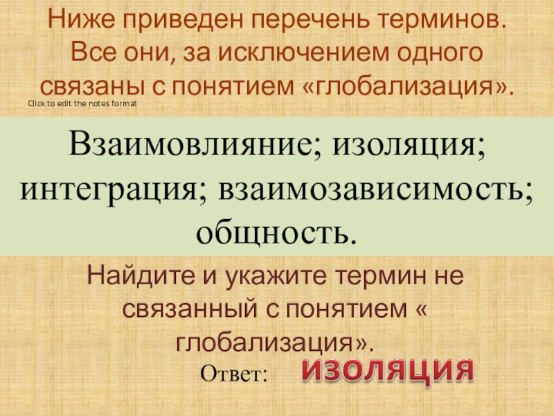 Найдите и укажите термин не связанный с понятием « глобализация».
