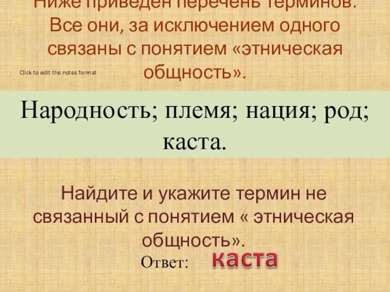 Найдите и укажите термин не связанный с понятием « этническая общность».