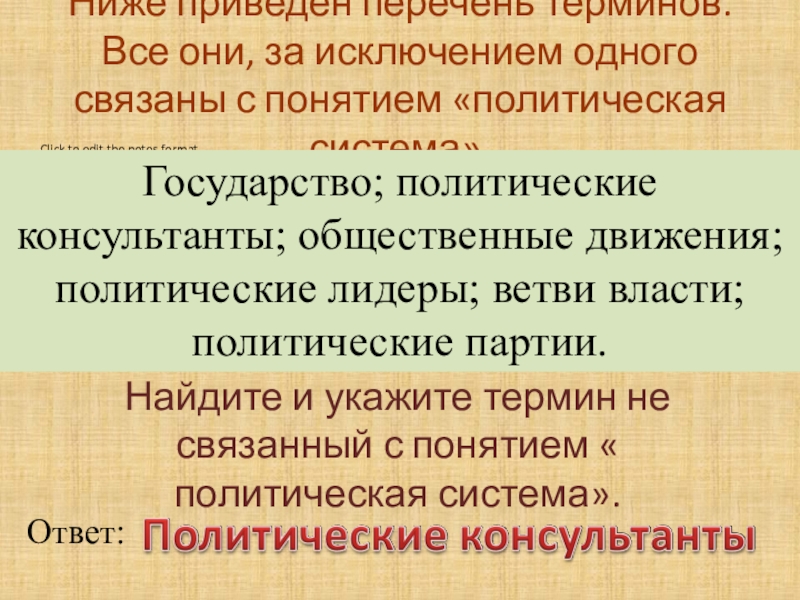 Найдите и укажите термин не связанный с понятием « политическая система».
