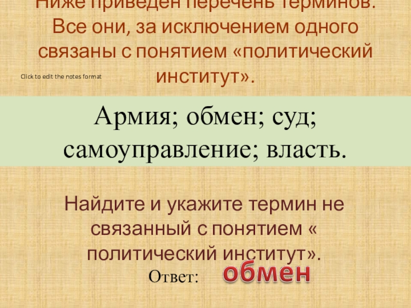 Найдите и укажите термин не связанный с понятием « политический институт».