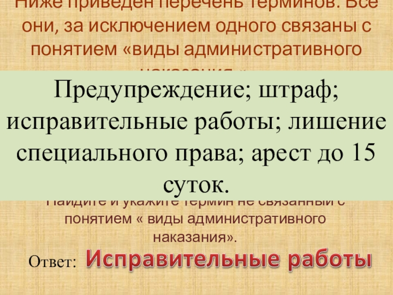 Найдите и укажите термин не связанный с понятием « виды административного наказания».