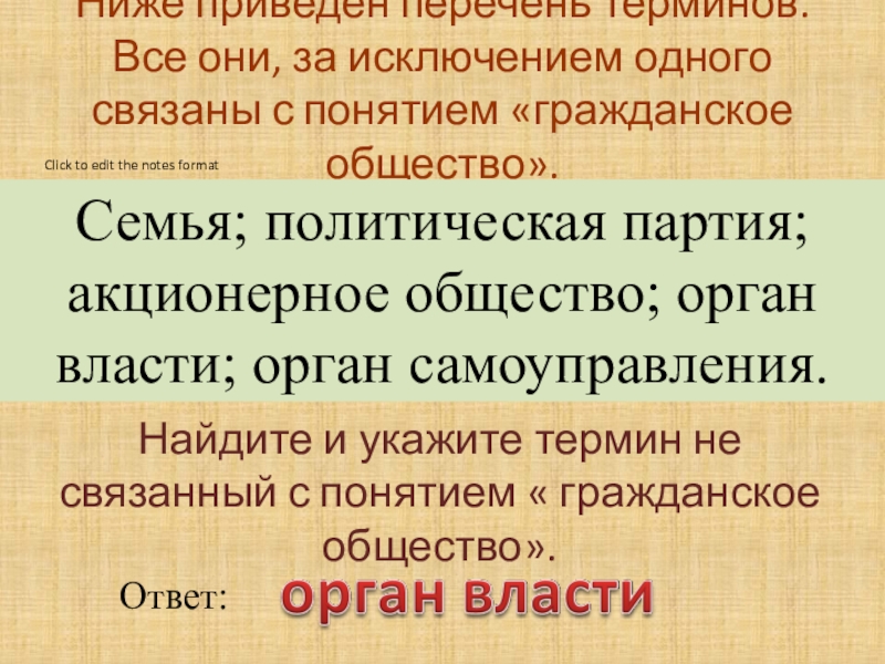 Семья; политическая партия; акционерное общество; орган власти; орган самоуправления.