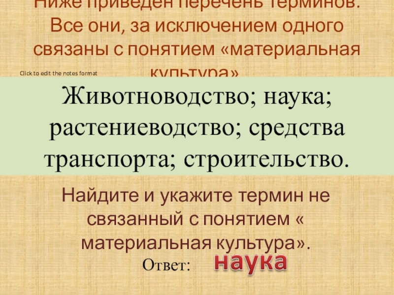Найдите и укажите термин не связанный с понятием « материальная культура».