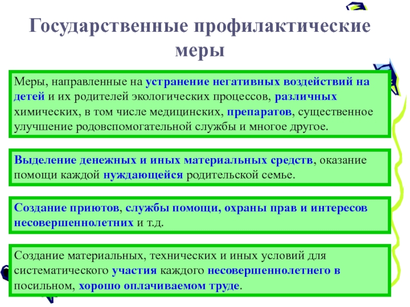 Создание приютов, службы помощи, охраны прав и интересов несовершеннолетних и т.д.