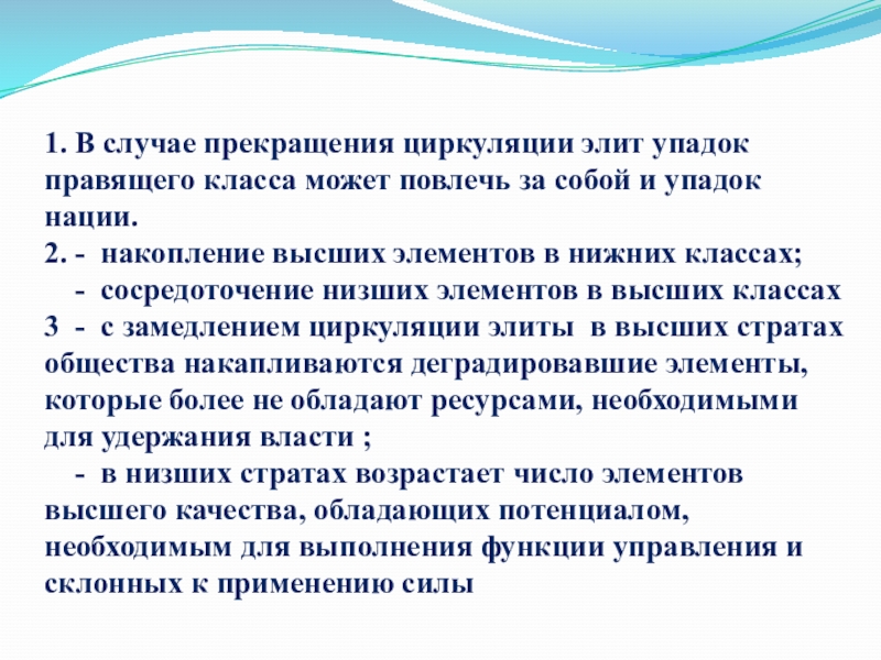 Слайд 21. В случае прекращения циркуляции элит упадок правящего класса может повлечь