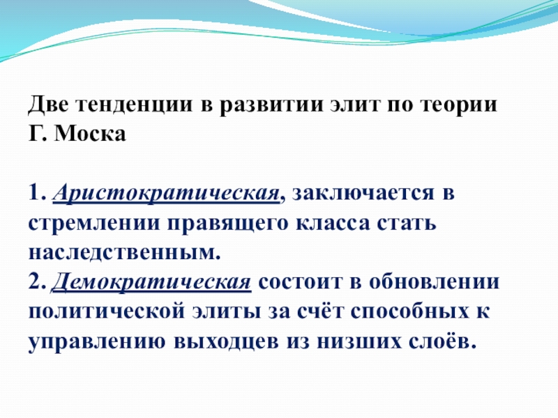 2. Демократическая состоит в обновлении политической элиты за счёт способных к управлению выходцев из низших слоёв.