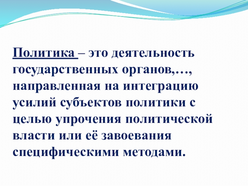 Слайд 4Политика – это деятельность государственных органов,…, направленная на интеграцию усилий субъектов