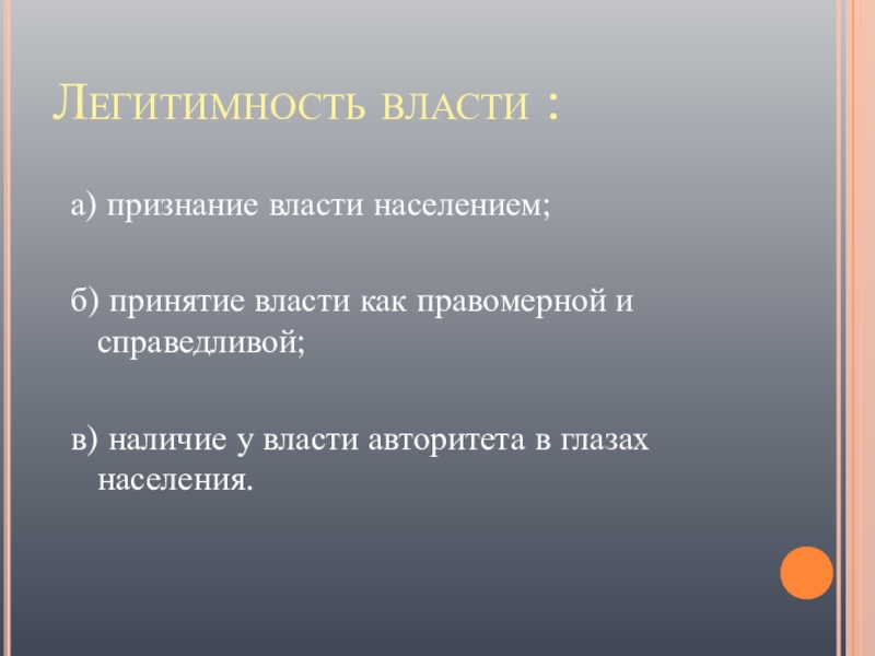 Слайд 20ЛЕГИТИМНОСТЬ ПОЛИТИЧЕСКОЙ ВЛАСТИ