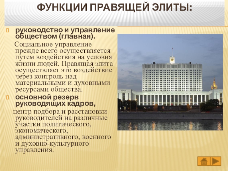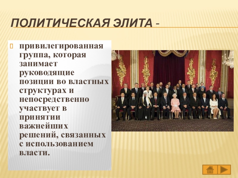 — это организованное меньшинство общества, внутренне дифференцированная, но высоко сплоченная социальная группа, обладающая качествами лидерства и подготовленная к выполнению управленческих функций, занимающая руководящие позиции в общественных институтах и непосредственно опосредованно влияющая на принятие властных решений в обществе.