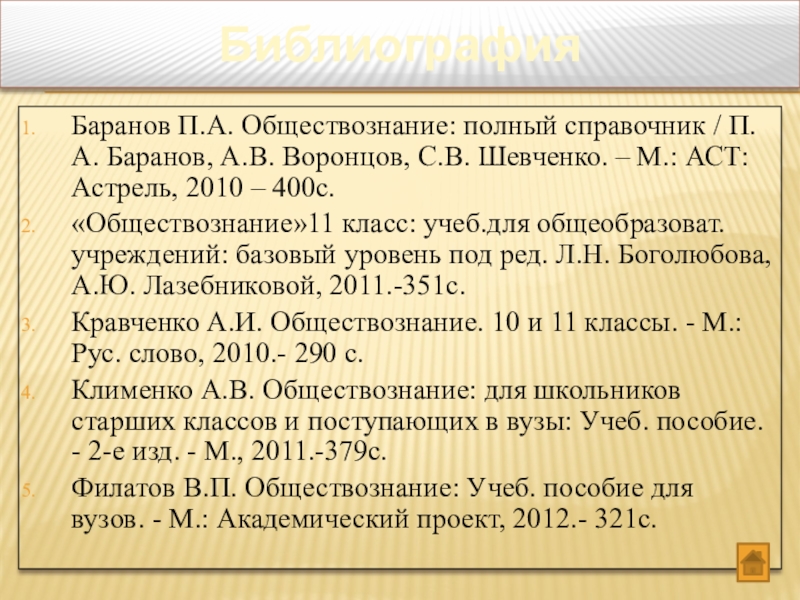 Кравченко А.И. Обществознание. 10 и 11 классы. - М.: Рус. слово, 2010.- 290 с.