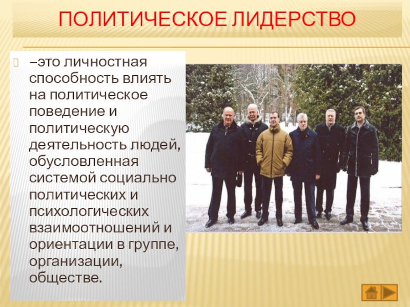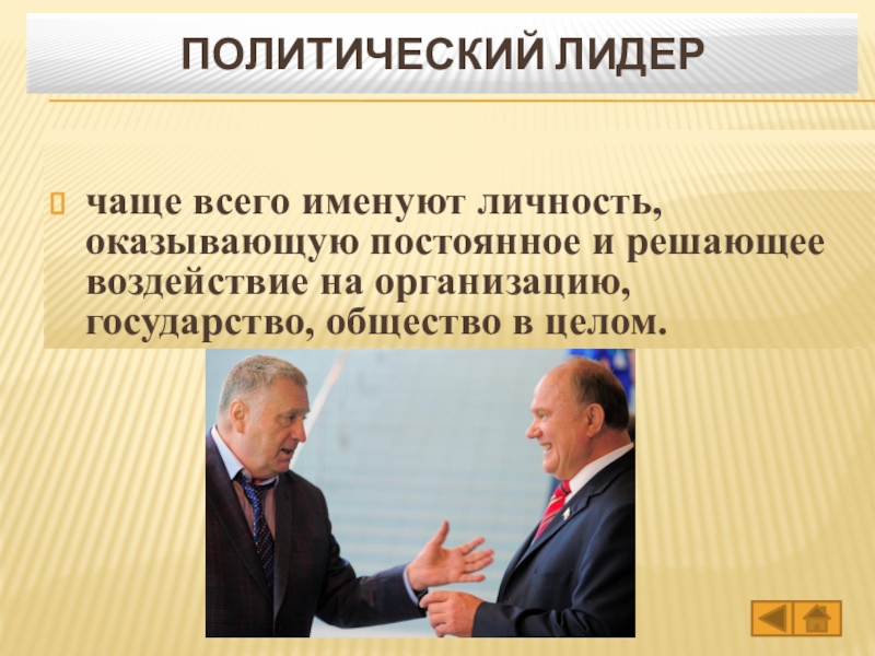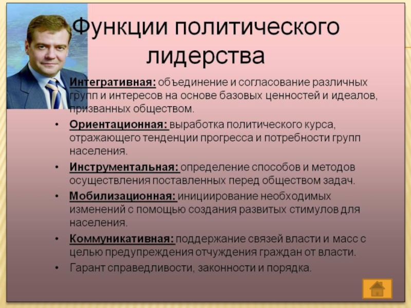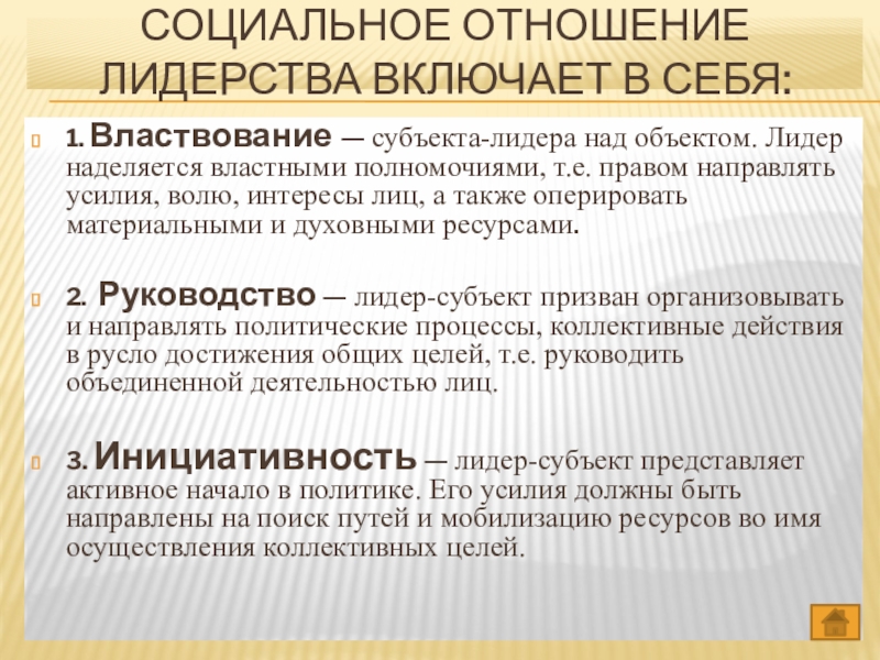 2. Руководство — лидер-субъект призван организовывать и направлять политические процессы, коллективные действия в русло достижения общих целей, т.е. руководить объединенной деятельностью лиц.