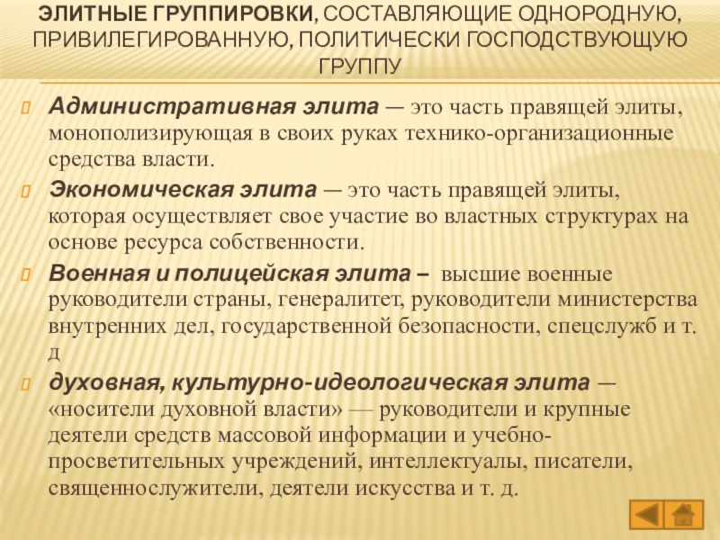 Элитные группировки, составляющие однородную, привилегированную, политически господствующую группу