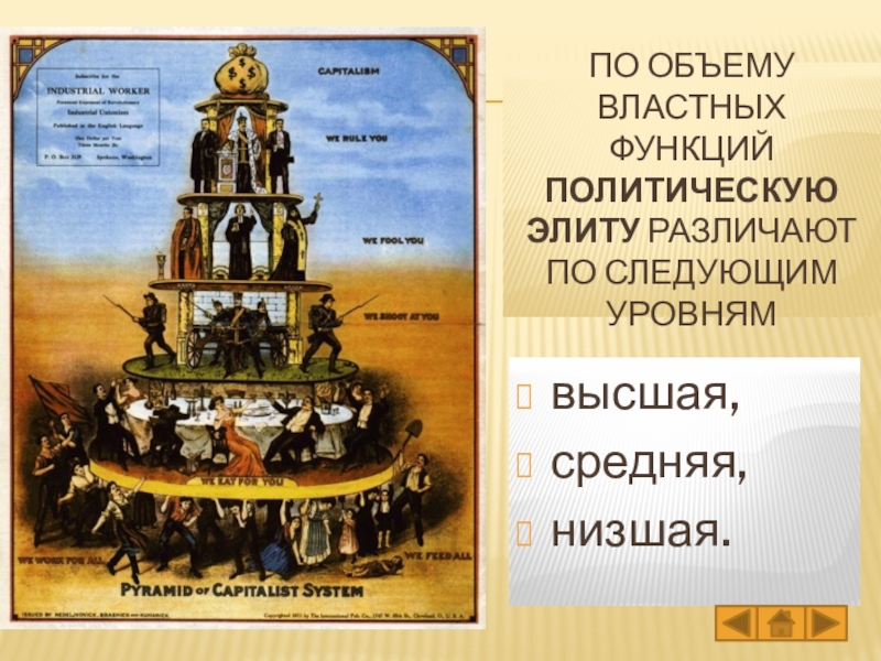 Слайд 13По объему властных функций политическую элиту различают по следующим уровням