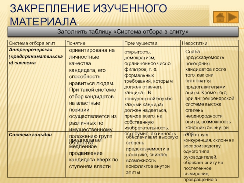 Недостатки: отсутствует конкуренция, склонна к воспроизводству одного типа руководителей, обрекает элиту на постепенное вымирание, превращение в замкнутую касту.