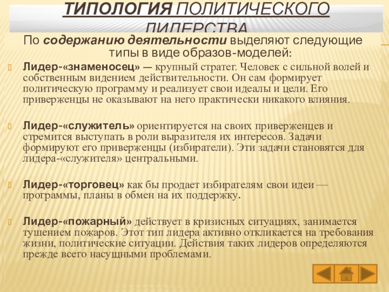 Лидер-«торговец» как бы продает избирателям свои идеи — программы, планы в обмен на их поддержку.