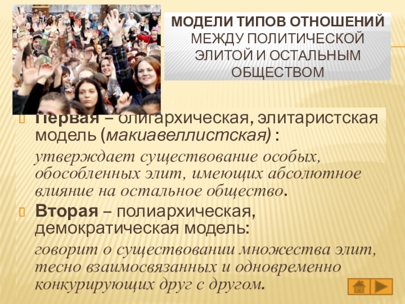 Слайд 12Модели типов отношений между политической элитой и остальным обществом