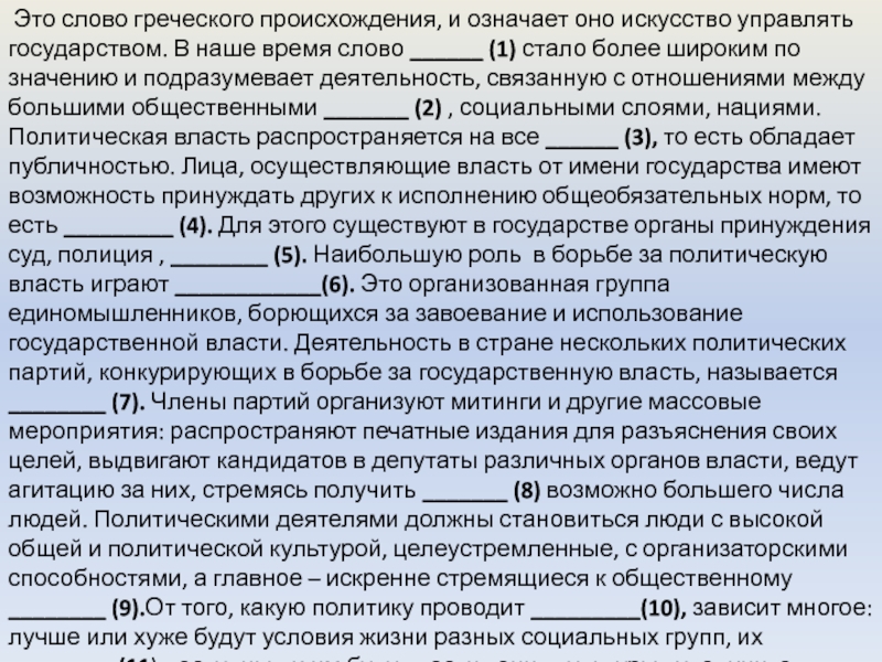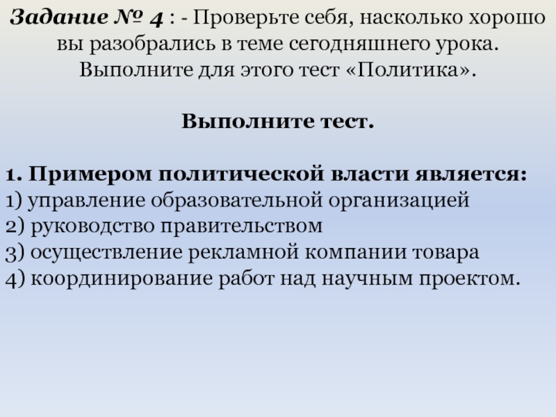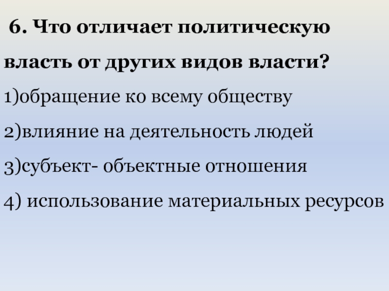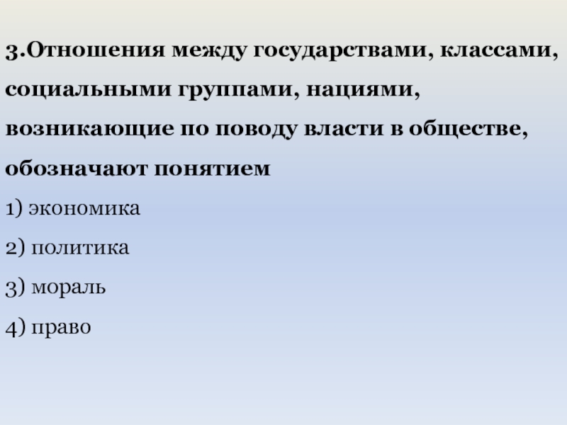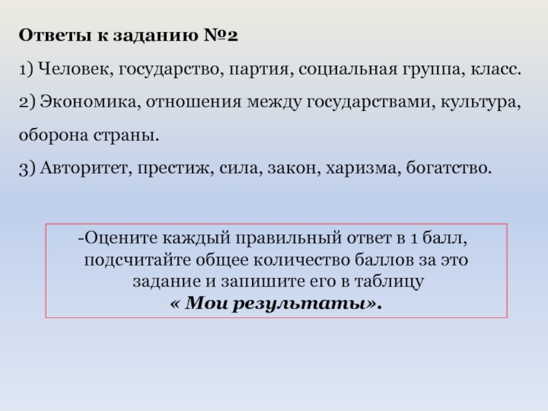 Авторитет, экономика, престиж, человек, отношения между государствами, социальная группа, харизма, государство, культура, партии, закон, класс, организация, сила, оборона страны, богатство.