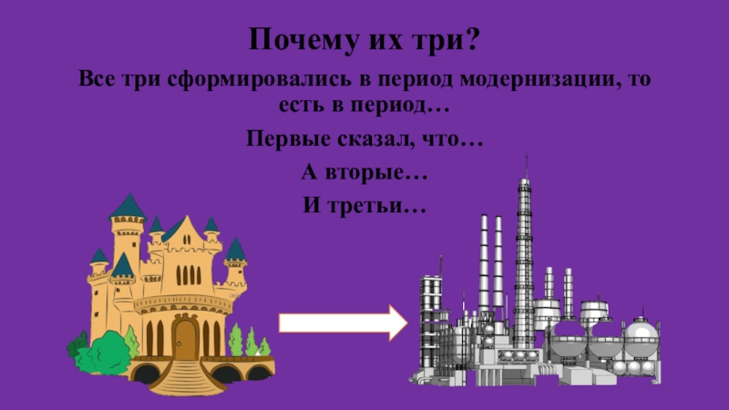 Почему их три?Все три сформировались в период модернизации, то есть в период…Первые сказал, что…А вторые…И третьи…