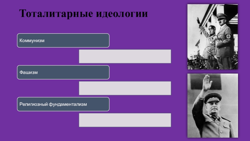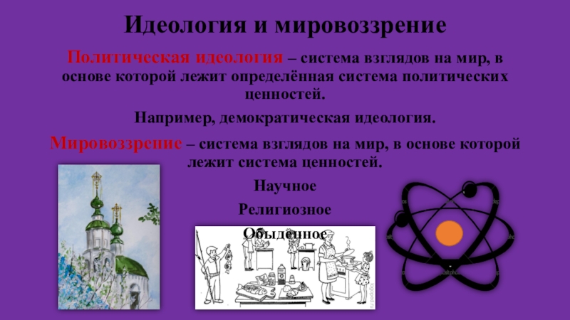 Идеология и мировоззрениеПолитическая идеология – система взглядов на мир, в основе которой лежит определённая система политических ценностей.Например,