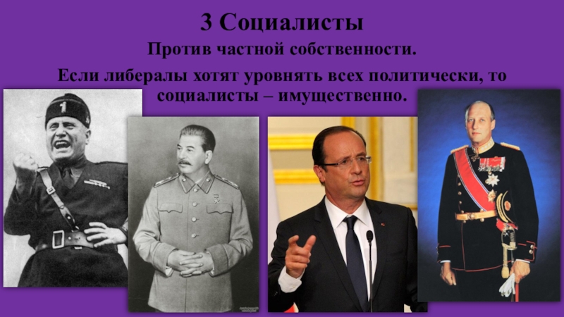 3 СоциалистыПротив частной собственности.Если либералы хотят уровнять всех политически, то социалисты – имущественно.
