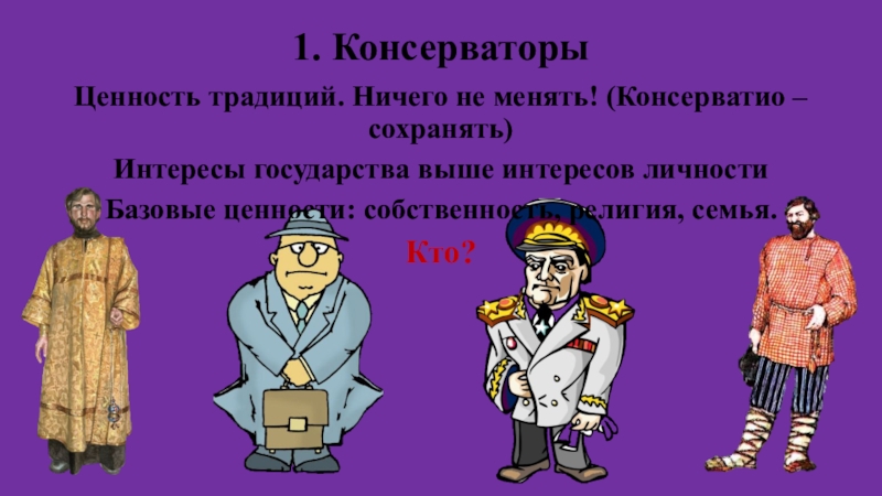 1. КонсерваторыЦенность традиций. Ничего не менять! (Консерватио – сохранять)Интересы государства выше интересов личностиБазовые ценности: собственность, религия, семья.Кто?