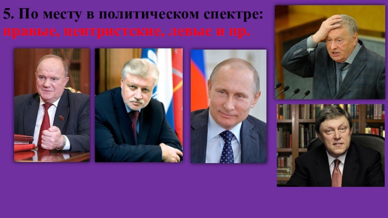 5. По месту в политическом спектре: правые, центристские, левые и пр.