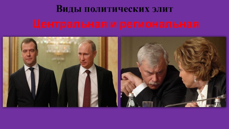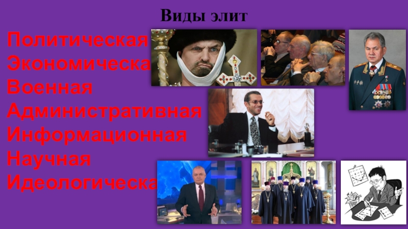 Виды элитПолитическаяЭкономическаяВоеннаяАдминистративнаяИнформационнаяНаучнаяИдеологическая