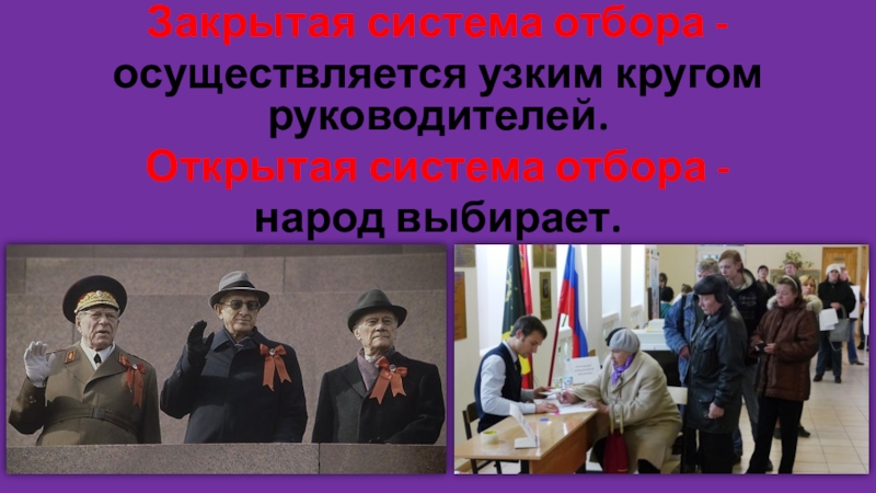 Закрытая система отбора -осуществляется узким кругом руководителей.Открытая система отбора -народ выбирает.