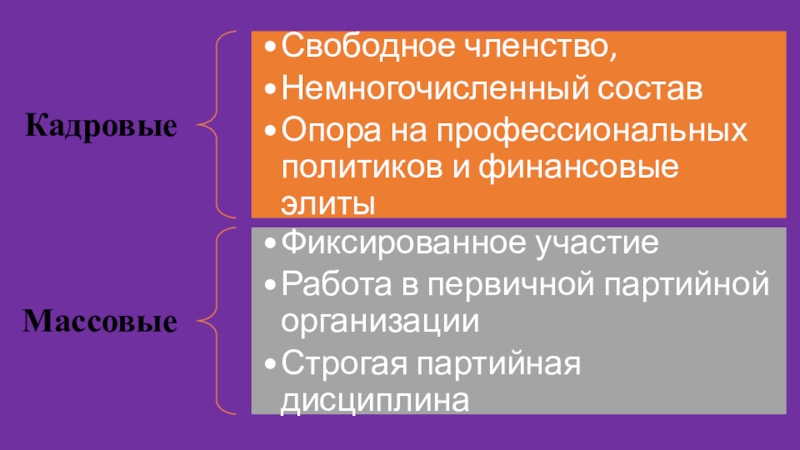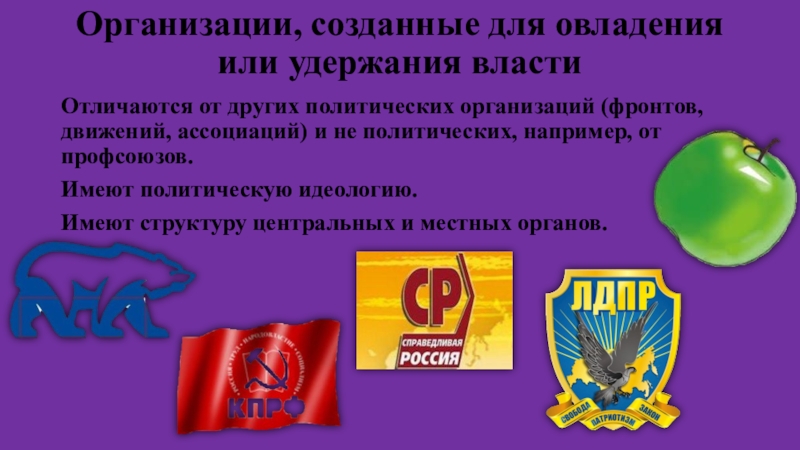 Организации, созданные для овладения или удержания властиОтличаются от других политических организаций (фронтов, движений, ассоциаций) и не политических,