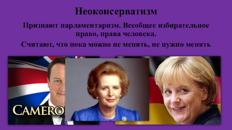 НеоконсерватизмПризнают парламентаризм. Всеобщее избирательное право, права человека.Считают, что пока можно не менять, не нужно менять