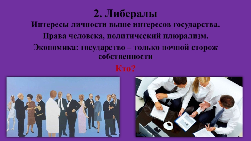 2. ЛибералыИнтересы личности выше интересов государства.Права человека, политический плюрализм.Экономика: государство – только ночной сторож собственностиКто?