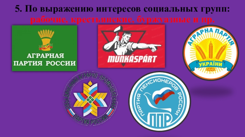 5. По выражению интересов социальных групп: рабочие, крестьянские, буржуазные и пр.