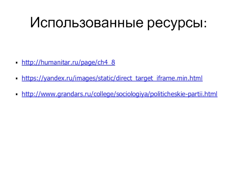 Использованные ресурсы:http://humanitar.ru/page/ch4_8https://yandex.ru/images/static/direct_target_iframe.min.htmlhttp://www.grandars.ru/college/sociologiya/politicheskie-partii.html