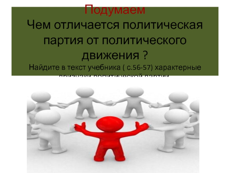 Подумаем  Чем отличается политическая партия от политического движения ? Найдите в текст учебника ( с.56-57) характерные