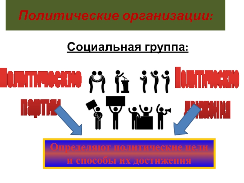 Социальная группа:Политические партииПолитическиедвиженияОпределяют политические цели и способы их достиженияПолитические организации:
