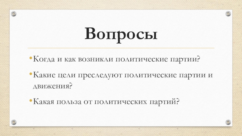 ВопросыКогда и как возникли политические партии?Какие цели преследуют политические партии и движения?Какая польза от политических партий?