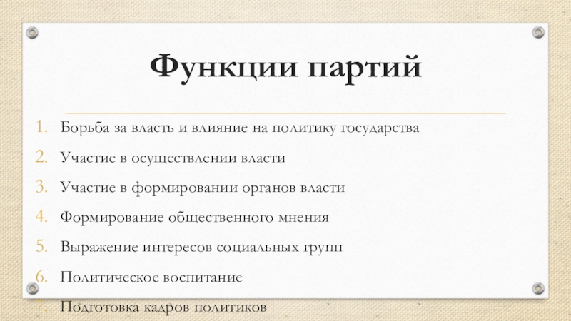 Функции партийБорьба за власть и влияние на политику государстваУчастие в осуществлении властиУчастие в формировании органов властиФормирование общественного