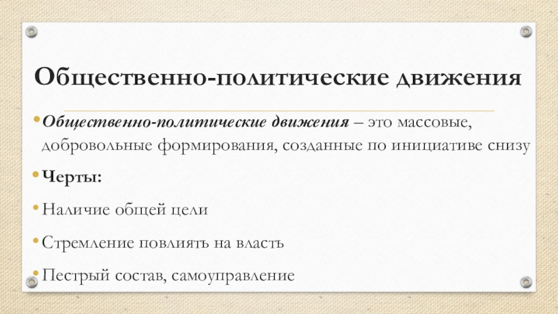 Общественно-политические движенияОбщественно-политические движения – это массовые, добровольные формирования, созданные по инициативе снизуЧерты:Наличие общей целиСтремление повлиять на властьПестрый