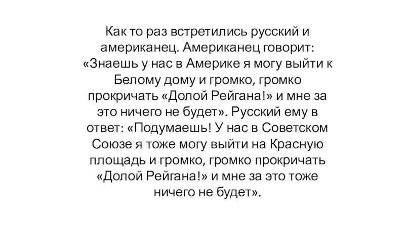в Америке я могу выйти к Белому дому и громко, громко прокричать «Долой Рейгана!» и мне за это ничего не будет». Русский ему в ответ: «Подумаешь! У нас в Советском Союзе я тоже могу выйти на Красную площадь и громко, громко прокричать «Долой Рейгана!» и мне за это тоже ничего не будет».